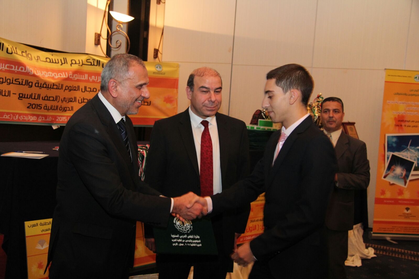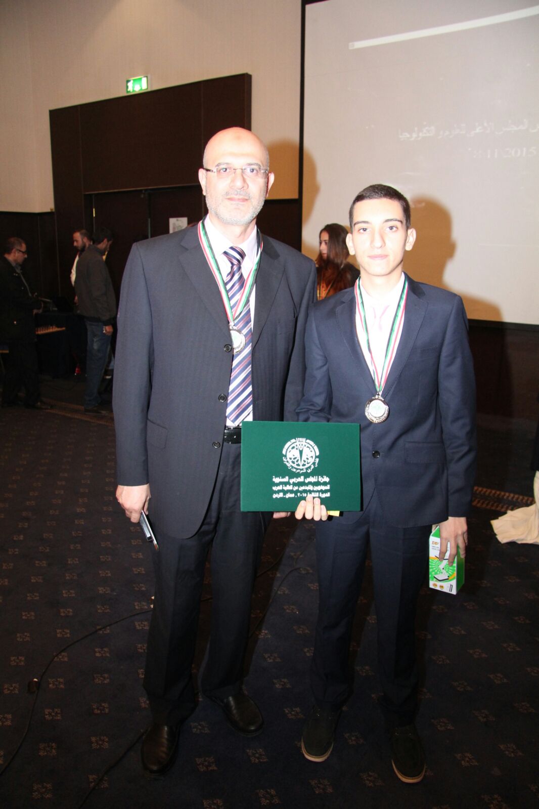 وتسلم الطالب الفائز درعاً تكريمياً وميدالية من رئاسة المجلس العربي للموهوبين والمبدعين، ويبدو في الصورة أدناه رئيس الشبكة المهندس باسم سعد مع الطالب الشرقاوي.